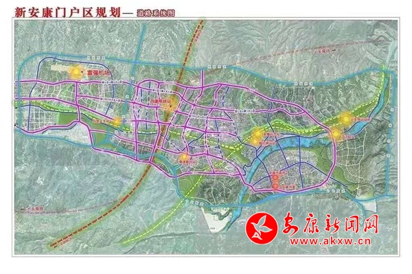 依據總體規劃,擬將安康高新區高新大道以西、北環快速干道以南、月河流域以北、寨河梁以東區域的60平方公里,規劃為新安康門戶區。在空間布局上,以高鐵安康西站為核心,以新時代大道、新安康大道、安康大道、創新路4條東西向城市主干道和高新大道、高新七路、高新十路、高新十二路、冉河西路、國賓大道6條南北向城市主干道為軸線,規劃布局新經濟引領區、臨空經濟區、新行政中心區、現代服務聚集區、安康特色產業區,以此打造“五大”門戶。