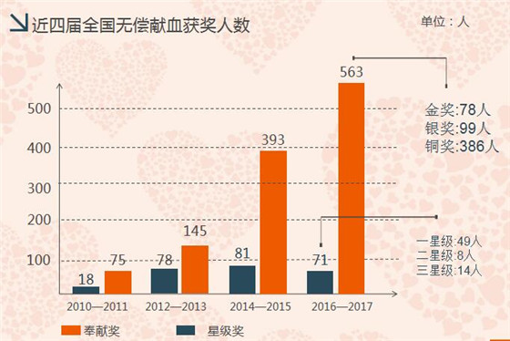 2016至2017年度安康申報全國獲獎人數(shù)634人次,其中:無償獻血奉獻獎計563人,金獎78人,銀獎99人,銅獎386人 ;全國星級志愿服務(wù)獎71人,一星級49人,二星級8人,三星級14人。連續(xù)五屆十年榮獲全國無償獻血先進城市;安康職業(yè)技術(shù)學(xué)院被評為全國無償獻血促進獎單位;我站站長胡章學(xué)被評為全國無償獻血促進獎個人。獲獎人數(shù)創(chuàng)歷史新高。