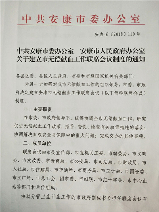2、安康市率先在全省建立首個無償獻血聯(lián)系會議制度 安康無償獻血聯(lián)席會議制度是在安康市委、市政府領(lǐng)導(dǎo)下,由市委宣傳部等21個市級部門和單位組成,協(xié)助分管衛(wèi)生計生工作的市政府副秘書長擔(dān)任聯(lián)席會議召集人。聯(lián)席會議每年召開一次全體會議,主要職責(zé)為統(tǒng)籌協(xié)調(diào)全市無償獻血工作,研究促進無償獻血工作相關(guān)政策,指導(dǎo)、督促、檢查有關(guān)政策措施的執(zhí)行落實,協(xié)調(diào)解決血液安全與保障中的重大問題。聯(lián)系會議制度的建立,標(biāo)志著我市無償獻血宣傳招募模式“政府主導(dǎo)、部門協(xié)作、社會參與、城鄉(xiāng)聯(lián)動”的發(fā)展格局和長效機制得到進一步鞏固和提升。