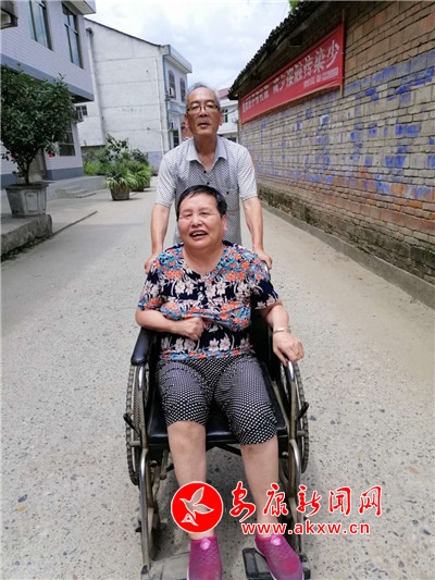 只要遇到好天氣,張業(yè)印就會用輪椅推著妻子到村部暢亮的大院巴上曬太陽,或一起到社區(qū)里鄰里之間串個門,一起聊家常;有時還會推著輪椅遠到陜南民俗村第一村的魯家大院轉(zhuǎn)一轉(zhuǎn),讓妻子始終保持著愉悅的好心情。