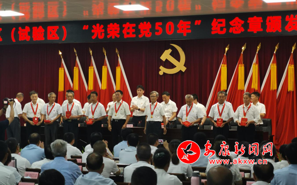 在慶“七一”表彰大會上,全體參會黨員面對鮮紅的黨旗,高舉右手,重溫入黨誓詞,鏗鏘嘹亮的宣誓聲響徹會場,激蕩人心,昭示著全區黨員矢志不渝為黨和人民事業不懈奮斗的堅定信念。會上,為高劍村黨支部等10個先進基層黨組織、王開昌等10名優秀黨務工作者、王天蒼等20名優秀共產黨員代表分別頒發了榮譽證書,為“光榮在黨五十年”的10名老黨員代表頒發了紀念章。