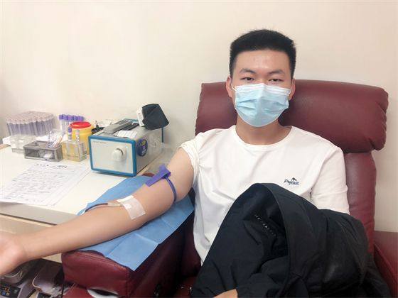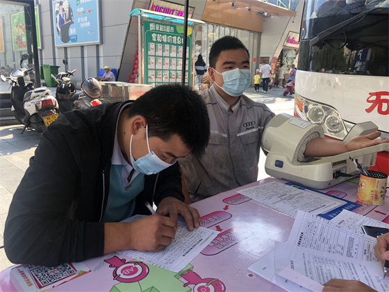 中秋節不僅街上熱鬧,獻血車上也熱鬧,鄧孟杰正坐在采血椅上獻血,他漂亮大方的女友站在旁邊跟他聊著晚上要吃什么,女友的弟弟坐在遠一點的地方玩著手機,女友的媽媽則坐在體檢桌前測量血壓,“一人獻血,三人陪同”的場景著實有點可愛,但鄧孟杰笑得十分開心,一直想獻血的他特別選了中秋這個日子,大概也是想和愛人親人一起分享這種美妙的人生體驗。鄧孟杰的女友拿起他的獻血證撒嬌到:“這次我們陪你,下次你也要陪我來獻血。”說完把手機塞給了一旁的弟弟,指揮他給自己和男友拍合照,一邊打趣弟弟拍照技術不好一邊把男友手里獻血證的位置調了又調。