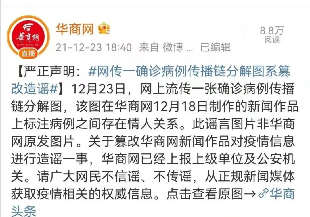 網(wǎng)上流傳一張確認(rèn)病例傳播鏈分解圖,在病例之間標(biāo)注“情人”關(guān)系,并傳言此次疫情傳播因素之一,是因?yàn)槲靼彩桌±c子牛門(mén)診的護(hù)士為情人關(guān)系,導(dǎo)致疫情擴(kuò)散,經(jīng)核實(shí),該圖盜用華商網(wǎng)12月18日制作的新聞作品圖片。該信息為虛假信息,造謠的人已被拘留。