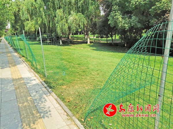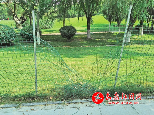 清明節期間,安康高新區運動公園內5處圍網被游人破壞。(王琳 攝)