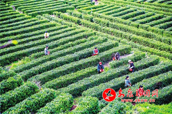 近年來,白河縣卡子鎮發展茶園面積近1300畝,帶動當地120余戶200余人,實現戶均增收2000元以上。圖為近日,茶農趁著濃濃春意在卡子鎮東壩桂花村茶園忙碌著。