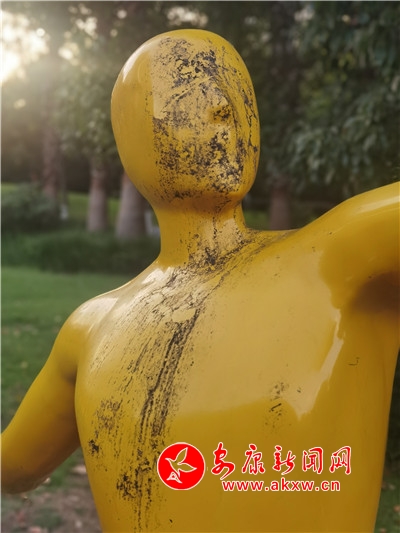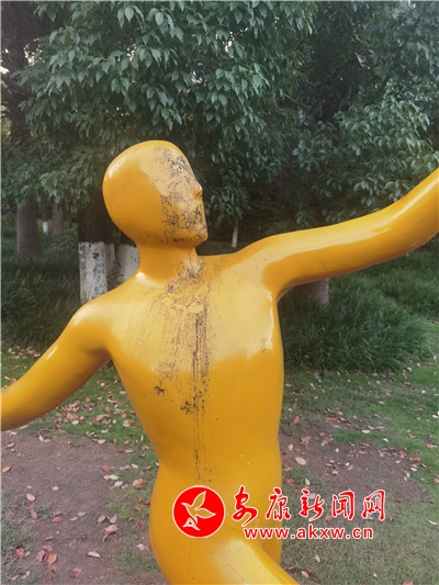 五一期間,安康高新區運動公園內,一處運動塑像遭人“抹黑”,污跡斑斑,有礙觀瞻。(記者 許安)?