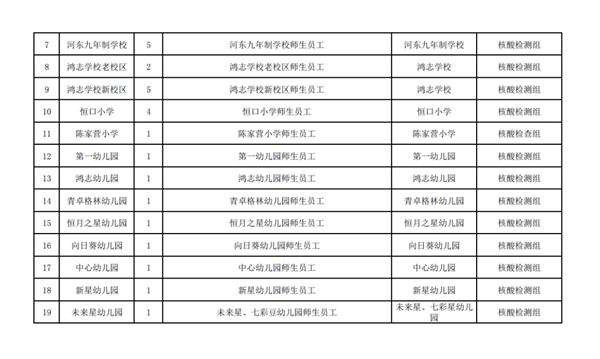 恒口示范區中心城區重點人群:一是黨政機關、企事業單位返崗人員、中小學校。幼兒園返校人員;二是“五一”假期有市域外旅居史人員;三是41類重點人群;四是市域外來恒返恒核酸檢測結果超過48小時人員;五是愿檢人員。