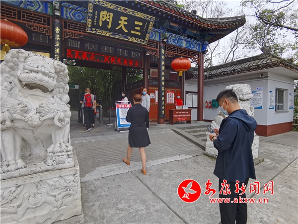 部分志愿者在志愿服務驛站為游客朋友提供咨詢服務、同時備有普通應急藥品,清涼油、藿香正氣水等防暑降溫物品供游客適用。一旁的工作人員在景區出入口引導游客配合測溫、查驗健康碼、掃場地碼、異地游客查驗48小時核酸陰性證明等,用實際行動助力全國文明城市創建。?