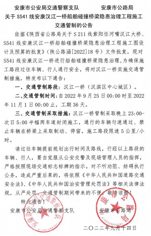 9月25日至11月1日安康漢江一橋將進行船舶碰撞橋梁隱患治理工程施工,將對漢江一橋實行交通管制36天,管制采取晚上23:00-次日5:00半幅兩車道封閉施工,通行的車輛勻速通過,禁止車輛在橋梁上采取制動、停留,施工路段限速5公里/小時。