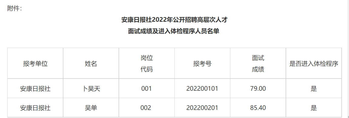 根據《安康日報社2022年公開招聘高層次人才公告》規定,現將安康日報社2022年公開招聘高層次人才面試成績及進入體檢程序人員名單(見附件)、體檢有關事項,公告如下: