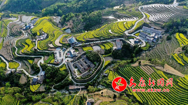 三三兩兩的房屋,就掩映在層疊的菜花梯田間,潔白的墻面,黛青的屋瓦,金燦的菜花,有種遺世獨立的靜美,塵世的喧囂一下子就遠了。尋一條鄉野小徑,步入茫茫花田間,不時有蜂蝶流連,孩童嬉鬧,農人牽著牛自不遠的長橋上悠悠走過,處處都流淌著鄉村田園的盎然春意。