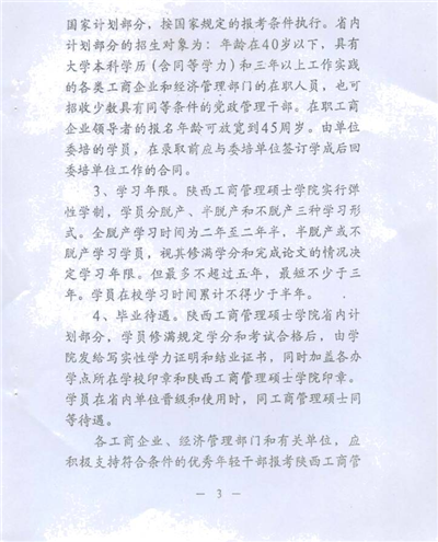 按照省政府有關文件規定,學員修滿規定的課程學分,完成畢業論文,通過論文答辯及評審后,由陜西工商管理碩士學院頒發畢業證書和學力證明。學員在省內單位晉級和使用時,視同工商管理碩士。