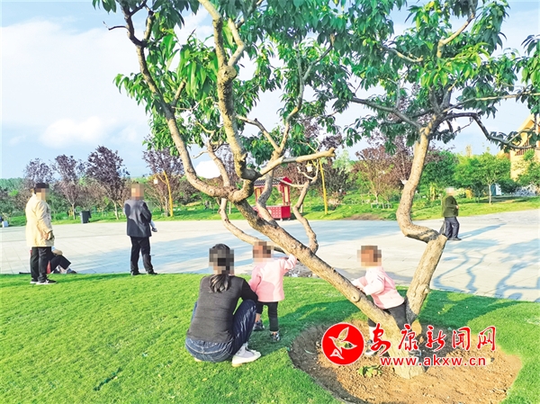 “五一”期間,在高新區桃花源景區,個別游客帶領小孩未按照相關規定文明規范游玩,小孩攀爬樹木,很是危險。(陳榮斌 攝)