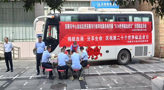 2023年6月14日,在第二十個世界獻(xiàn)血者日當(dāng)天,安康市中心血站聯(lián)合市行政審批服務(wù)局開展了“文明有我 無償獻(xiàn)血 傳遞溫暖”無償獻(xiàn)血志愿服務(wù)活動。
