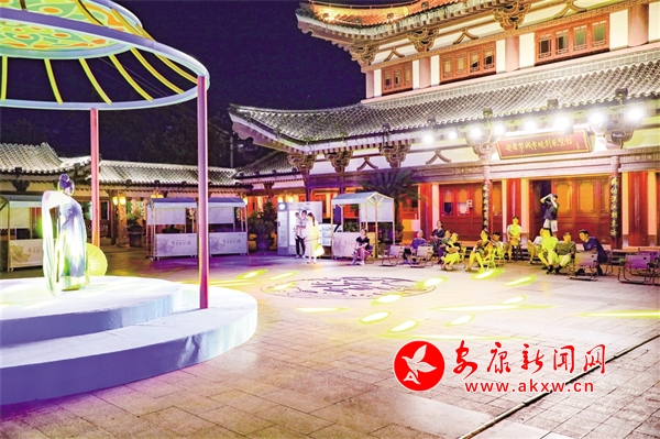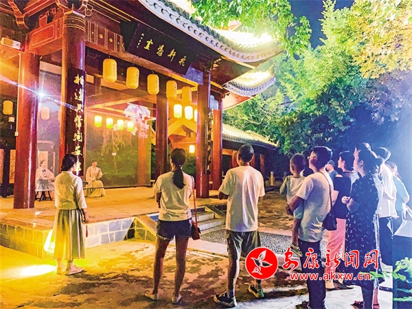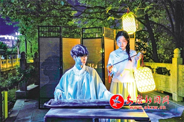 還未走近安瀾樓,就被一首琵琶曲改編的絲竹樂曲《春江花月夜》吸引,流暢多變的節奏,巧妙細膩的配器,絲絲入扣的演奏,仿佛將觀眾帶入那個月夜春江的迷人景色。環繞安瀾樓四周,畫家楊炳昌筆下的金州八景,仿佛一秒穿越古今,勝景徐徐、浮現腦際。