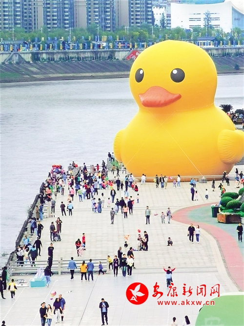國慶期間,安康城區漢江公園一只大大的“黃鴨”成為了市民新的打卡地。吳定國 攝