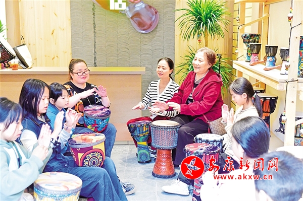 國慶期間,漢陰雙河口古鎮游客爆滿。圖為游客在古鎮手鼓店體驗打手鼓。陳浩 攝
