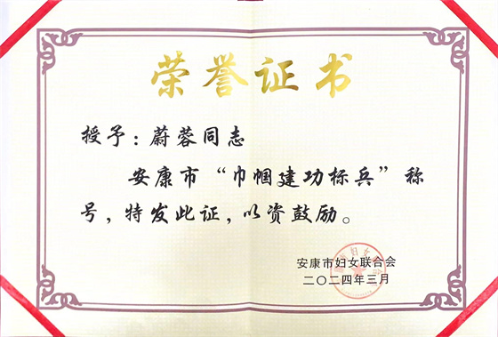 為表揚先進,樹立榜樣模范,在“三八”國際婦女節到來前夕,安康市婦聯印發了《關于授予李少華等68人安康市三八紅旗手 漢濱區融媒體中心等32個單位安康市三八紅旗集體稱號的決定》《關于授予成玉榮等73人安康市巾幗建功標兵漢濱區檔案史志館等38個集體安康市巾幗文明崗稱號的通報》,安康市中心血站榮獲“市級三八紅旗集體”榮譽稱號,供血科科長蔚蓉同志榮獲全市“巾幗建功標兵”榮譽稱號。