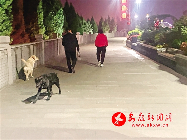 4月5日晚,安康城區城堤上有市民遛狗不牽繩。胡波 攝?
