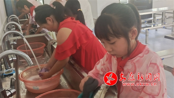 自己動手,豐衣足食。全體學生輪流為大家就餐服務,服務學生在早晨課前時間全程參與監督廚房食材的出庫、加工、留樣過程;在午餐前15分鐘來到餐廳為同學打飯、端菜,在就餐結束后全體學生一起清洗餐具、打掃廚房;并做好每日食堂就餐服務日志。