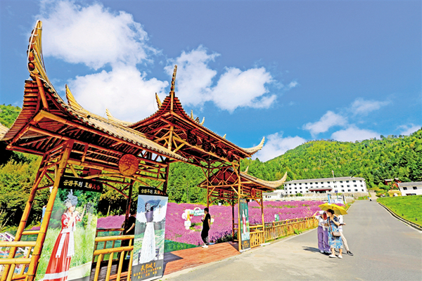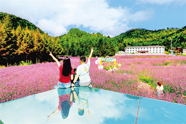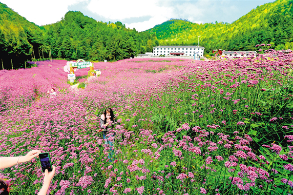 中秋節期間,平利千家坪森林公園天書峽馬鞭草花競相怒放。如畫的景色吸引眾多游客前來賞景打卡。(詹永桂 攝)