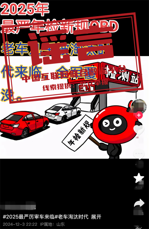 真相:近日,多個自媒體賬號發布消息,宣稱“史上最嚴車檢來了”“車檢年限變化”“燃油車年檢增加OBD檢測”等。中央廣電總臺中國之聲記者多方求證了解到,上述說法均為不實消息,目前各地車檢并沒有新變化。