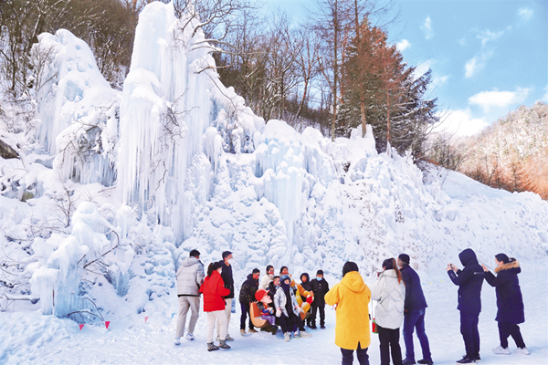 游客在冰瀑區合影留念