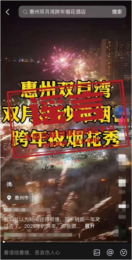 真相:近期,網絡上出現 “廣東惠州雙月灣2025跨年煙花秀”“2025雙月灣跨年倒數夜”“雙月灣跨年煙花秀”等信息,引發(fā)關注。經相關部門核實,網傳信息均系不實信息。目前廣東省惠州市惠東縣雙月灣沒有舉辦2025年跨年煙花秀活動的安排,請廣大游客不聽謠、不信謠、不傳謠,一切以官方發(fā)布信息為準。(來源:“惠州日報”微信公眾號、惠東文旅體)