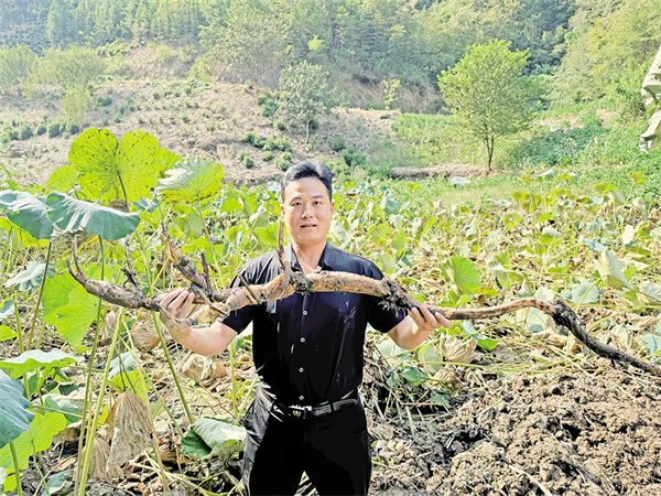 蒿坪鎮王家河村蓮藕喜獲豐收,包村干部為蓮藕作宣傳。 劉姝含 攝
