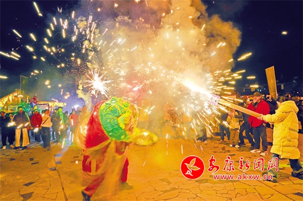 夜幕降臨,在中壩作坊小鎮(zhèn)廣場上,音樂響起,熊熊篝火燃燒,伴隨著動感的音樂,游客與居民們手牽手,肩并肩,圍著篝火載歌載舞。而最吸引人的還是舞火龍、火獅子表演,在璀璨煙火中,火龍飛舞盤旋,火獅子搖頭晃腦,騰挪跳躍,威風八面,現(xiàn)場不少游客噴起煙花,花燒得越旺、鑼鼓聲越急,獅子舞得也越歡快,大家共同享受著這場精彩紛呈的非遺文化盛宴。