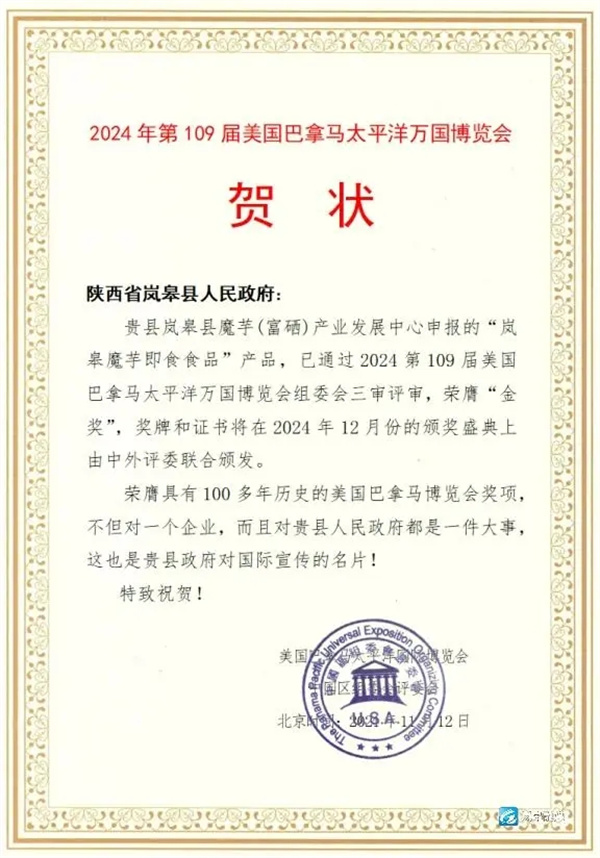 1月8日,筆者從泰國曼谷舉行的2024年第109屆美國巴拿馬太平洋萬國博覽會頒獎盛典上獲悉,由嵐皋縣魔芋產業發展中心申報的“嵐皋魔芋即食食品”,榮膺2024年第109屆美國巴拿馬太平洋萬國博覽會“金獎”。
