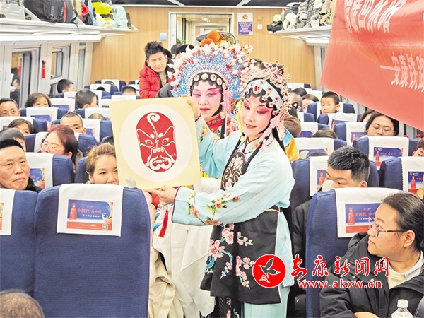 火車穿越秦巴山水間,途中,來自安康漢調二黃研究院的專業演員和地方民間漢調二黃愛好者們一同表演了國家級非物質文化遺產——漢調二黃經典戲曲演唱,并為旅客們講解漢調二黃戲曲知識,與旅客們開展互動交流,讓旅客親身體驗漢調二黃戲服道具,感受漢調二黃的獨特藝術魅力。來自漢濱區文化館的漢濱剪紙技藝傳承人為旅客們展示講解了安康市級非物質文化遺產——漢濱剪紙技藝,向參與互動的旅客送上了親手創作的漢濱剪紙作品,提前送上新春祝福。活動中,西安鐵路公安局安康公安處的民警們和文藝工作者們一同宣傳普及了反詐知識,進一步提升旅客的安全防范意識。