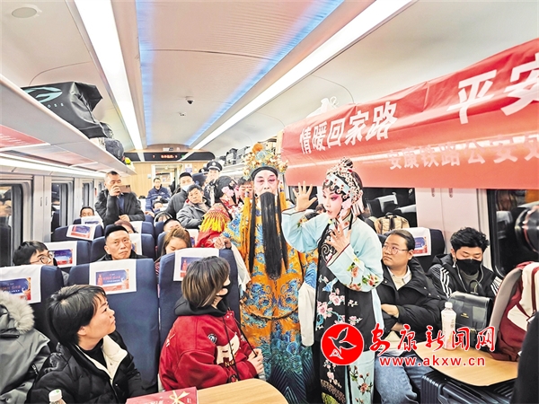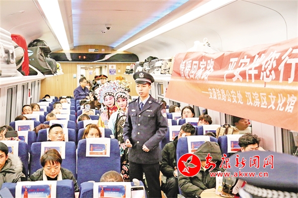 1月14日,由西安開往達州的D173次列車上,西安鐵路公安局安康公安處聯合漢濱區文化館、安康漢調二黃研究院的文藝工作者,以地方非物質文化遺產技藝展示等方式,結合春運開展反詐知識宣講,讓旅客們在春運旅途中感受安康地方傳統文化獨特魅力,提升安全意識。