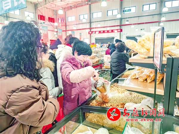 “這里的年貨品類齊全、物美價廉,我選了一些干果和調味料,聽說這里的豬肉都是農家喂養的,看起來很新鮮,一會兒還要買一些回去嘗一嘗?!壁s集的劉女士一邊開心地展示著自己選購的商品,一邊和導購交流。
