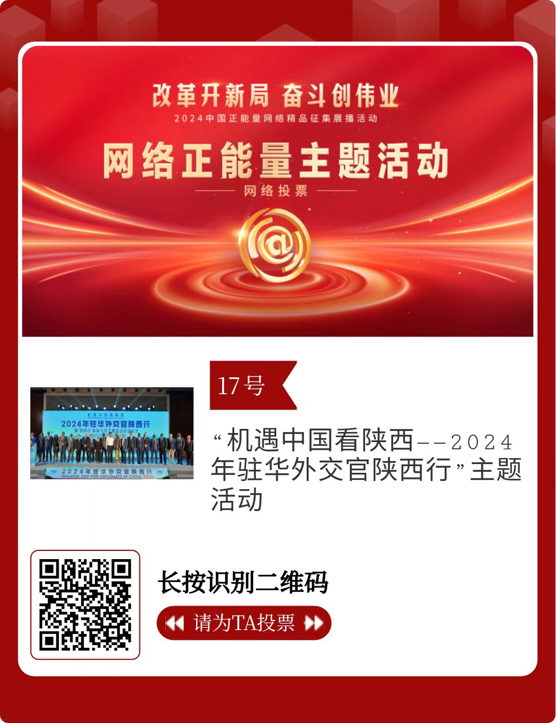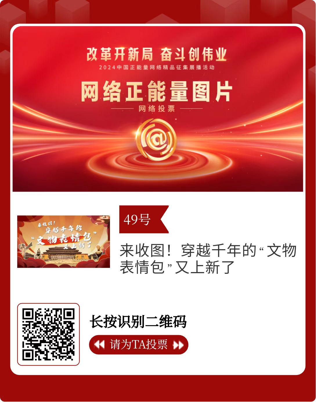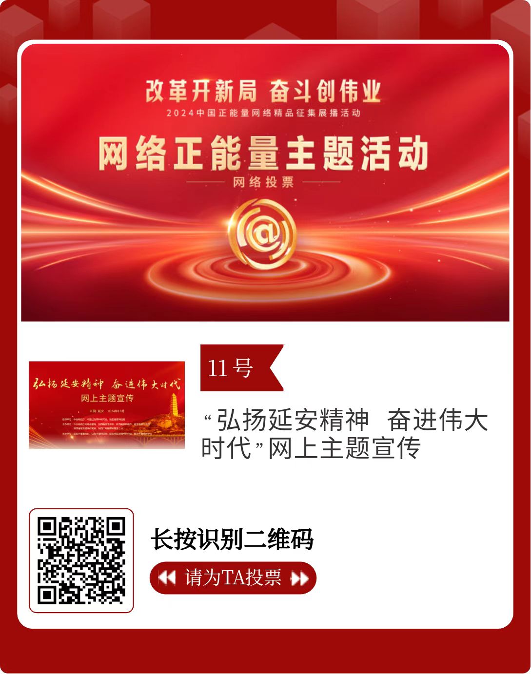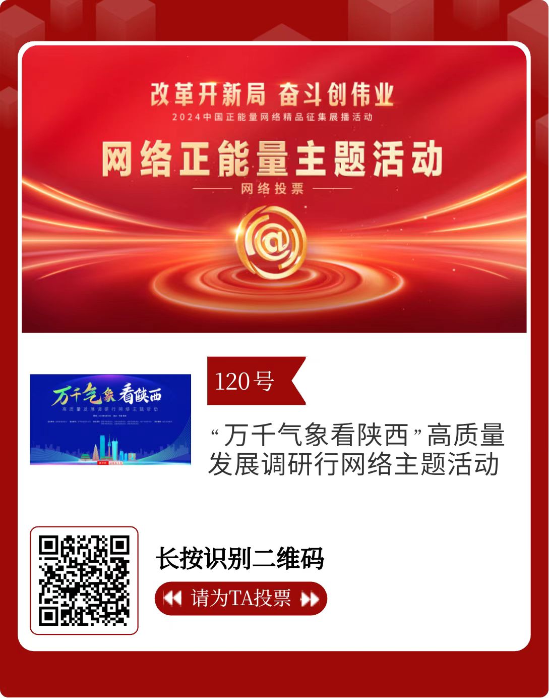 改革開新局,奮斗創偉業。由中央網信辦主辦的2024中國正能量網絡精品征集展播活動今天啟動網絡展播投票。