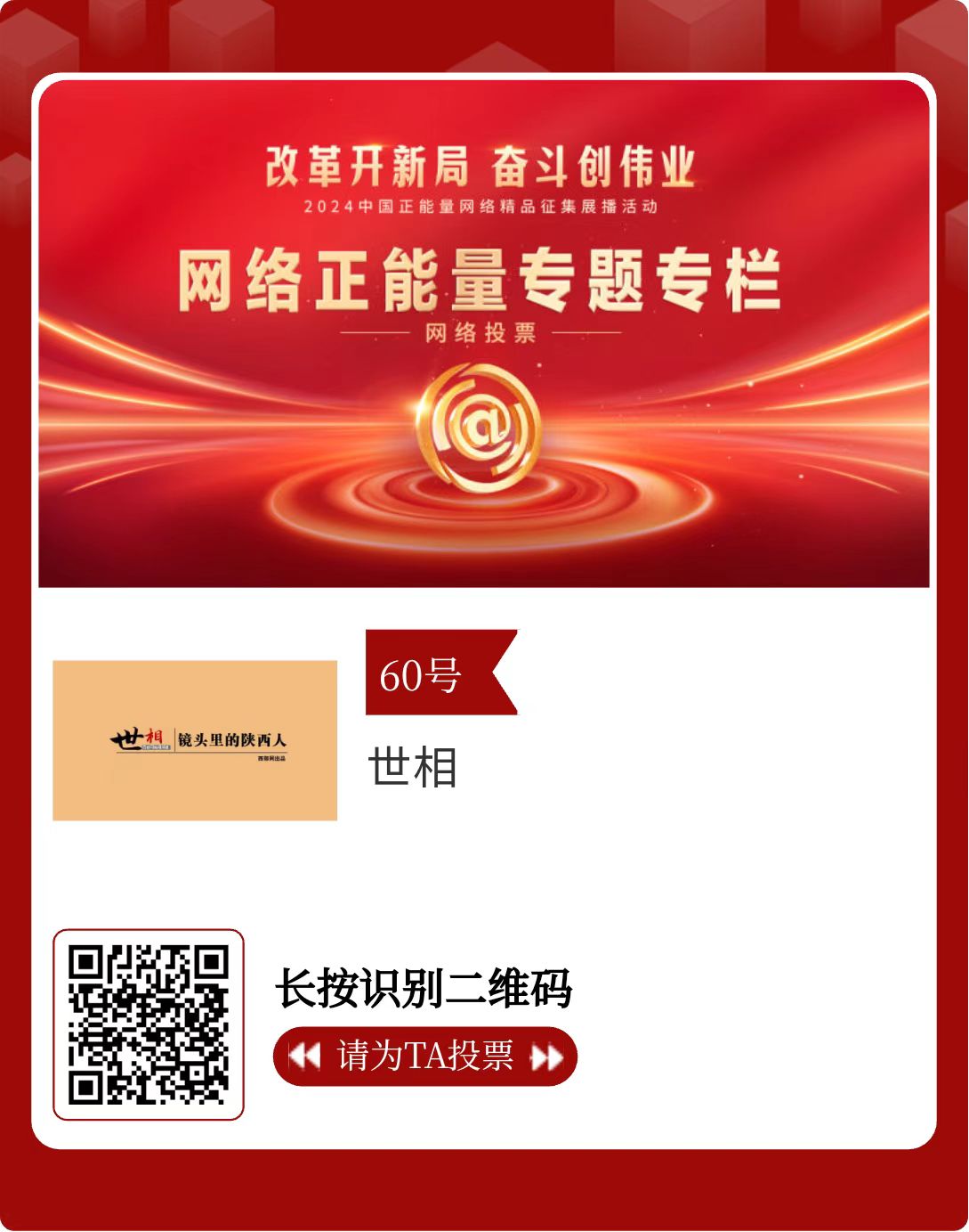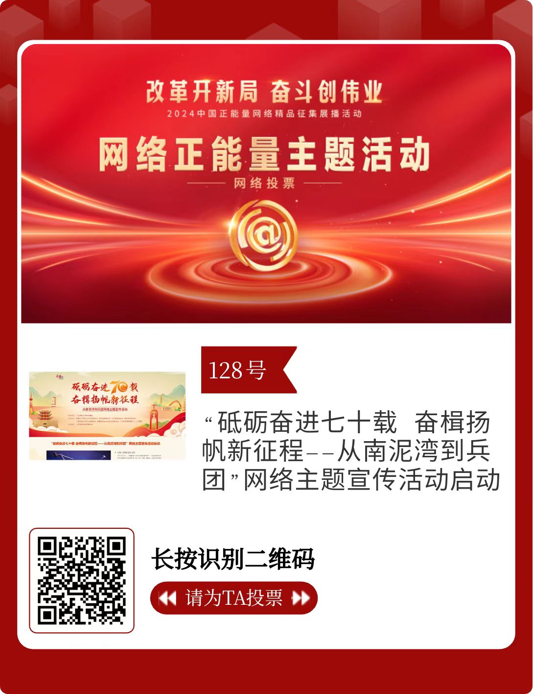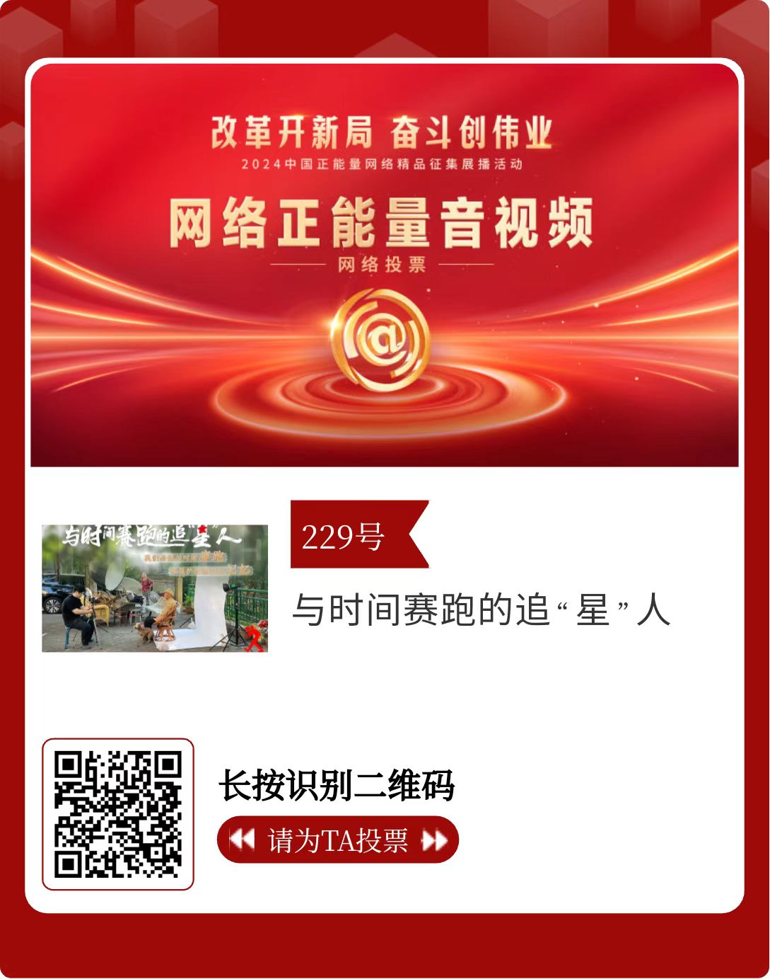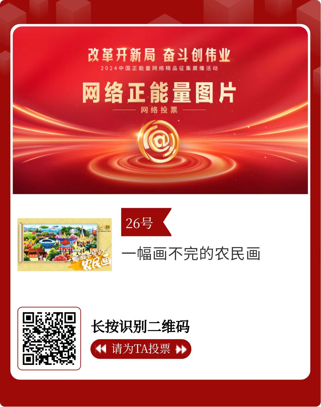 改革開新局,奮斗創偉業。由中央網信辦主辦的2024中國正能量網絡精品征集展播活動今天啟動網絡展播投票。