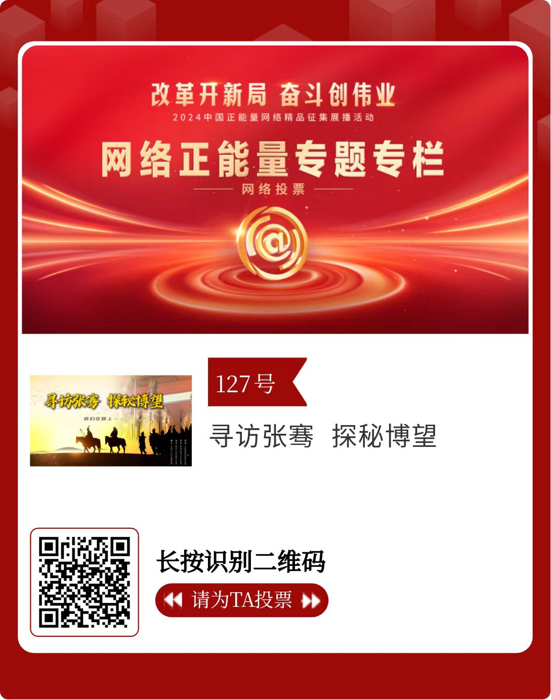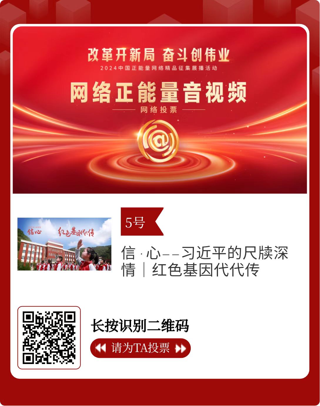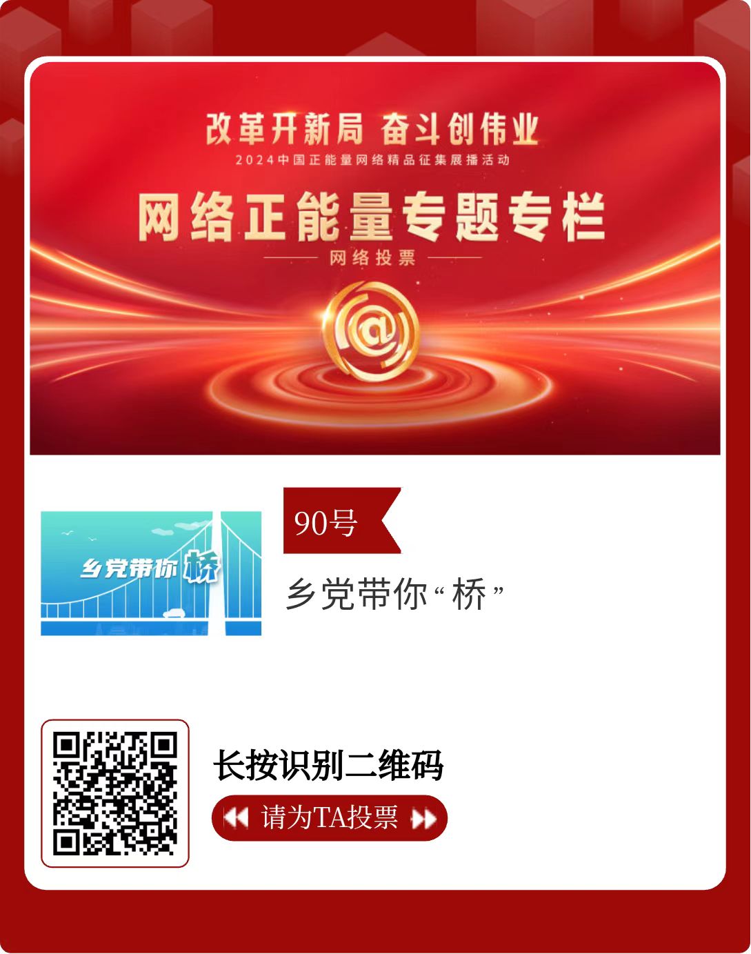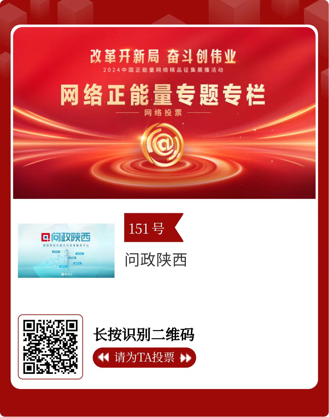 改革開新局,奮斗創偉業。由中央網信辦主辦的2024中國正能量網絡精品征集展播活動今天啟動網絡展播投票。