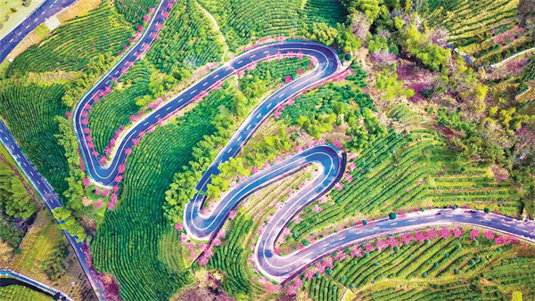 沿著茶山步道拾級而上,茶農采青的竹簍與游人拍照的紗巾在梯田間次第閃現。粉白相間的梅花如云絮般綴滿枝頭,風過處,花瓣簌簌落入茶叢,為嫩綠的新芽染上淡淡馨香。遠處黛瓦白墻的徽派民居與近處起伏的茶壟構成天然畫框,無人機視角下,蜿蜒的茶道如同玉帶纏繞山腰,將紅楓、櫻花、梅林串成斑斕的珠鏈。