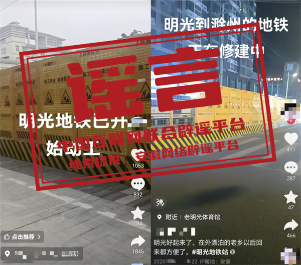 真相:近日,網(wǎng)民“張**”“沙**”等發(fā)布視頻,編造并傳播“明光地鐵已開(kāi)始動(dòng)工”相關(guān)虛假信息,并配以誤導(dǎo)性視頻,引發(fā)關(guān)注和討論。經(jīng)核實(shí),相關(guān)視頻內(nèi)容對(duì)應(yīng)區(qū)域施工項(xiàng)目并非修建地鐵,網(wǎng)傳視頻系謠言。明光市委網(wǎng)信辦和市公安局已依法對(duì)張某、沙某等進(jìn)行批評(píng)教育,并要求其刪除相關(guān)不實(shí)信息。(來(lái)源:“安徽省互聯(lián)網(wǎng)違法和不良信息舉報(bào)”微信公眾號(hào)、明光市委網(wǎng)信辦)