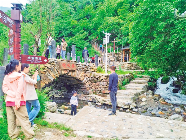 2020年以來,雙河鎮黨委、政府以市場化改革破題,號召在外創業能人陳守林等人回鄉協助開發水洞溝?!耙屬Y源變資產,首先得打通‘任督二脈’?!标愂亓纸榻B說:“雙河鎮政府累計投入資金800余萬元,治理景區河道6公里、鋪設石板步道4.5公里、搭建石拱橋6座,新建多處公廁,并完善停車場、旅游標識系統等配套基礎設施?!边@一系列舉措讓“養在深閨”的水洞溝景區,蛻變為可進入、可游覽、可消費的旅游目的地。