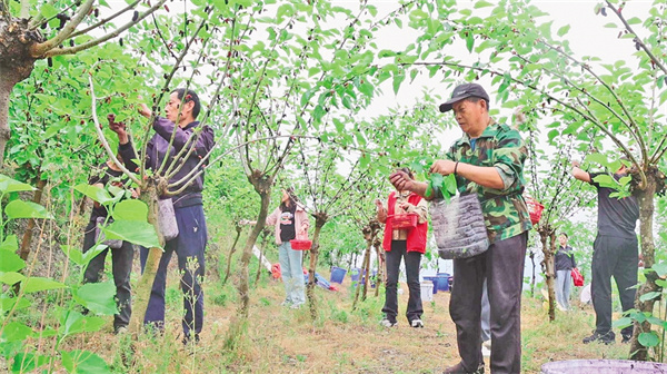 劉術榮的桑樹枝繁葉茂,桑葚掛滿枝頭,吸引了市民和游客觀光采摘。他每天請了十幾名工人幫忙,抓緊時間采收桑葚。經過科學管護,這片果桑園每年能產桑葚超過20噸,帶動30余戶村民實現穩定增收。