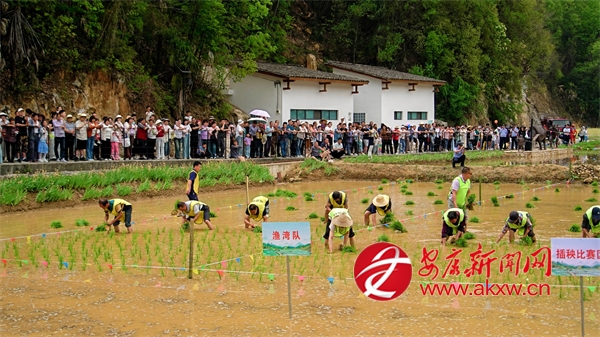 10點50分,插秧比賽正式開始,只見寨溝村、龍泉村、漁灣村、湯坪村四支隊伍在水田中依次排開。 隨著清脆的哨響,四支插秧隊伍迅速進入狀態,水田瞬間化作激烈的賽場。彎腰俯身,左手攥緊秧苗,右手分秧、插秧,一株株嫩綠的秧苗被精準插入田中,泥水飛濺間,選手們你追我趕,汗水與歡笑交織,將傳統農事活動演繹成了一場精彩絕倫的視覺盛宴。