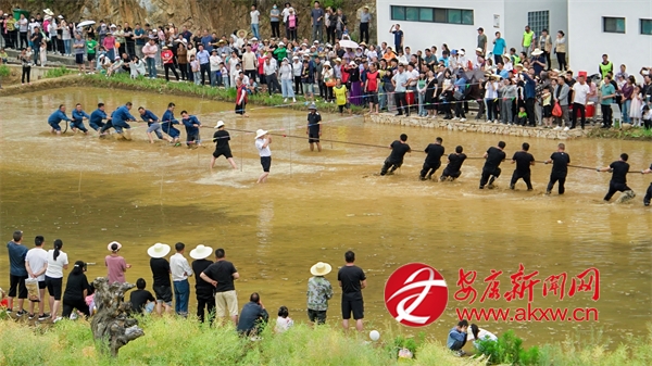 插秧比賽后緊接著開展了拔河比賽,參賽者們光著腳在泥濘的田里奮力拉扯,你來我往,互不相讓,田邊的觀眾則奮力地為自己支持的隊伍加油鼓勁。稻田抓鴨捕魚活動讓現場氣氛更加熱烈,觀眾紛紛脫下鞋襪,卷起褲腿,在稻田中追逐游魚和鴨子,歡快的笑聲此起彼伏。?