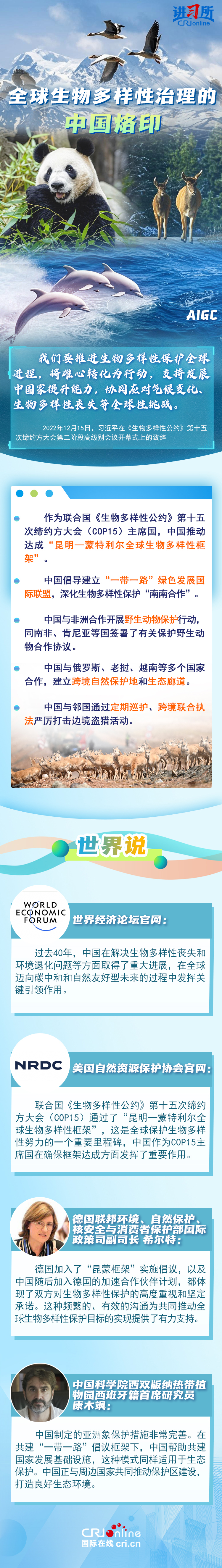 “心往一處想、勁往一處使,共建地球生命共同體?!弊鳛樽钤绾炇?、批準《生物多樣性公約》的締約方之一,生物多樣性保護已經上升為中國的國家發展戰略。國際人士表示,中國的一系列舉措體現出對生態環境保護的堅定決心,同時,中國依托共建“一帶一路”倡議等國際合作機制,為推動全球生物多樣性保護提供了有力支持,在邁向自然友好型未來的過程中發揮關鍵的引領作用。
