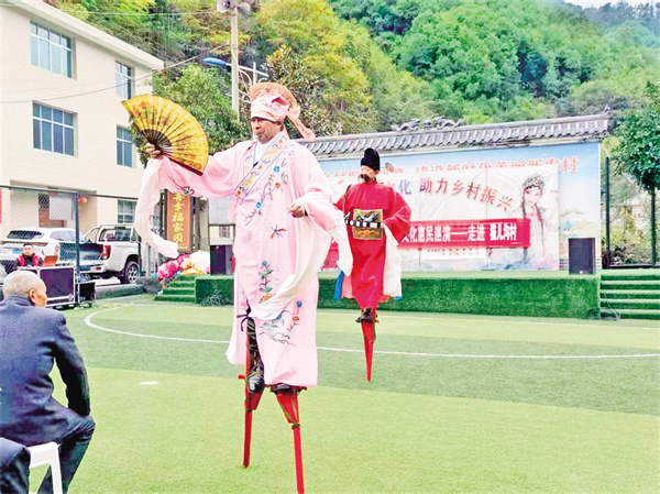 在五峰村,村支部書記羅仁春告訴記者,2023年村委會牽頭成立了五峰村文化民俗文藝協會,陸續加入的48名會員涵蓋老中青三代,既有傳承高蹺絕技的老人,也有主動學習弦子腔的年青一代。今年32歲的村民小梅加入協會后,一改往日下班后悶在家中的狀態,每天下午吃完飯都會下樓和新認識的姐妹載歌載舞,很快就成為舞蹈隊的主力。“以前不知道我們村上還有文藝協會,自從村上干部告訴我后,我就趕緊加入了這個小團體,既鍛煉了身體,又愉悅了心情,生活幸福感越來越強烈。”身著舞蹈服的小梅身姿婀娜,水袖飛揚間,明媚的笑容如花一樣燦爛。