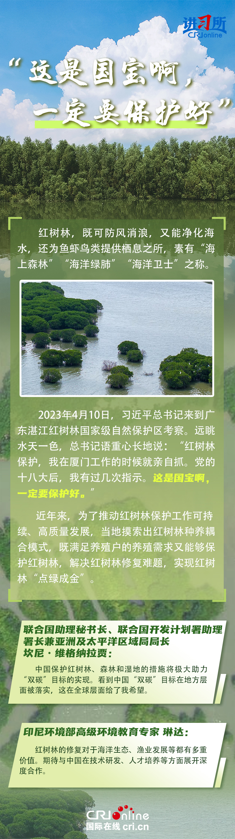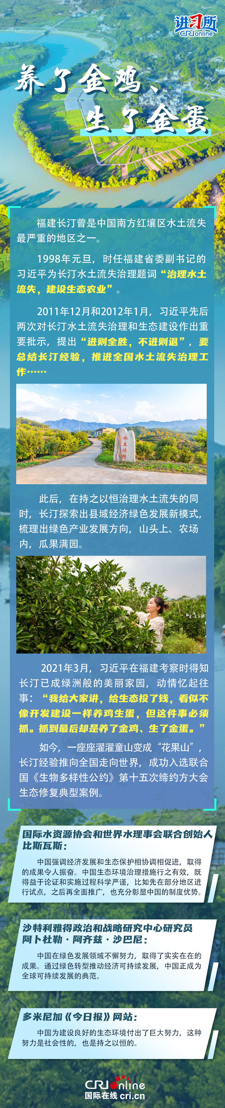 新時代以來,在習近平生態文明思想的科學指引下,“兩山”理念已深入人心,從“點綠成金”的紅樹林到一座座“花果山”,再到走向世界的長汀經驗……美麗中國建設邁出重大步伐,生態環境保護發生歷史性變化。國際社會認為,中國取得廣泛的綠色發展成就,從根本上源于習近平生態文明思想,特別是“兩山”理念的指引。在通過綠色轉型推動經濟可持續發展方面,中國正成為全球可持續發展的典范。