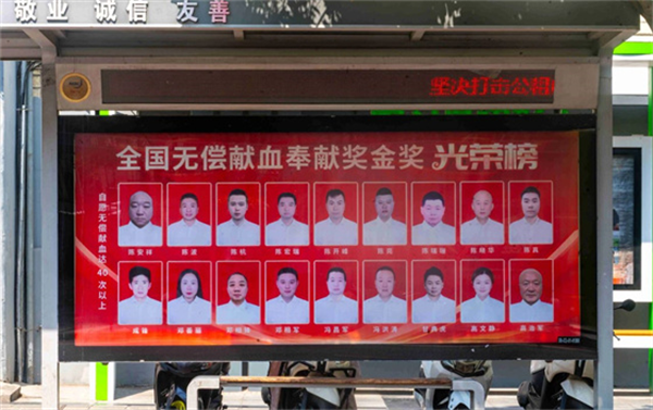 在第22個世界獻血者日到來之際,安康市中心血站精心策劃,自6月中旬起,在位于市政務大廳、市中心醫院、市中心醫院北院區門前的三處公交候車亭,以及中心城區兩處LED大屏上,全天循環展播著安康市榮獲“全國無償獻血奉獻獎”終身榮譽獎、金獎、銀獎、銅獎的獲獎者代表風采照片。