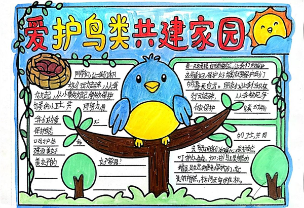 守護藍天精靈,共享美好家園!《安康高新區愛鳥護鳥倡議書》發布以來,全區的孩子們積極行動,他們用畫筆以純真之心勾勒出對鳥兒的關愛與守護。他們把對鳥兒的喜愛融進顏料,將守護的心愿畫入畫紙。稚嫩的筆觸下,有給小鳥搭建的溫暖巢穴,有禁止捕鳥的醒目標語,有鳥兒在藍天自由翱翔的愜意,有人類與鳥兒和諧共處的溫馨,有孩子們與鳥兒牽手同行的幻想…… (通訊員 劉松)