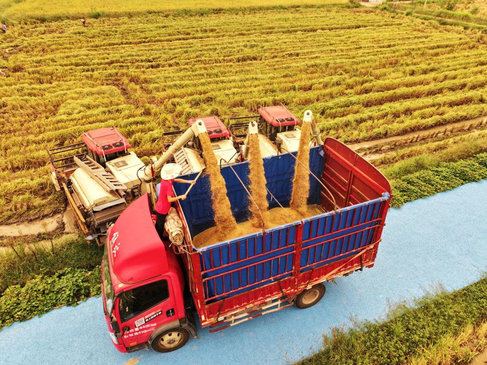 近日,四川省達州市渠縣有慶鎮太陽村農民轉運剛收獲的水稻(無人機照片)。白露節氣之際,各地農民搶抓農時,田間地頭一片農忙景象。新華社發(鄧良奎 攝)