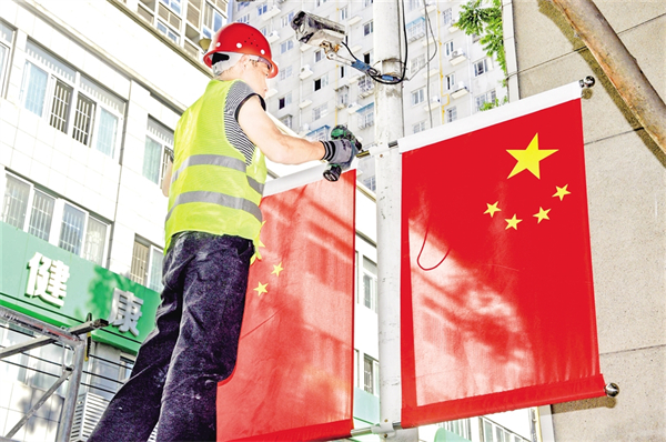 9月25日,紫陽(yáng)縣城區(qū)橋溝路的大道上,工人正在懸掛國(guó)旗。?彭召伍 攝